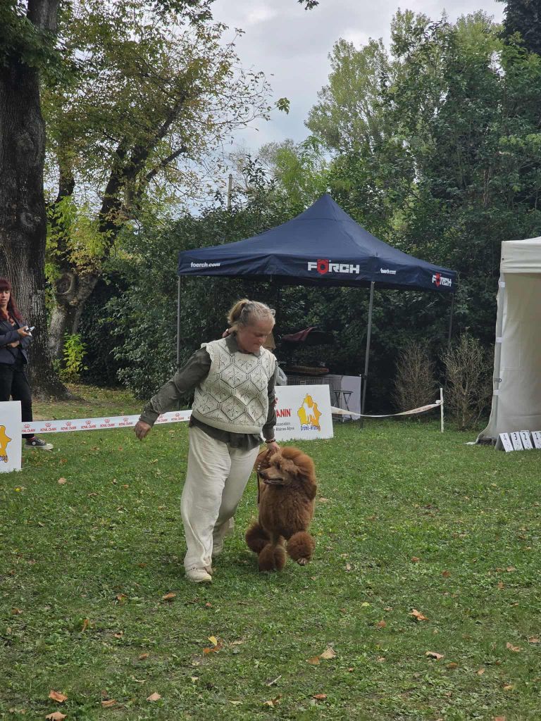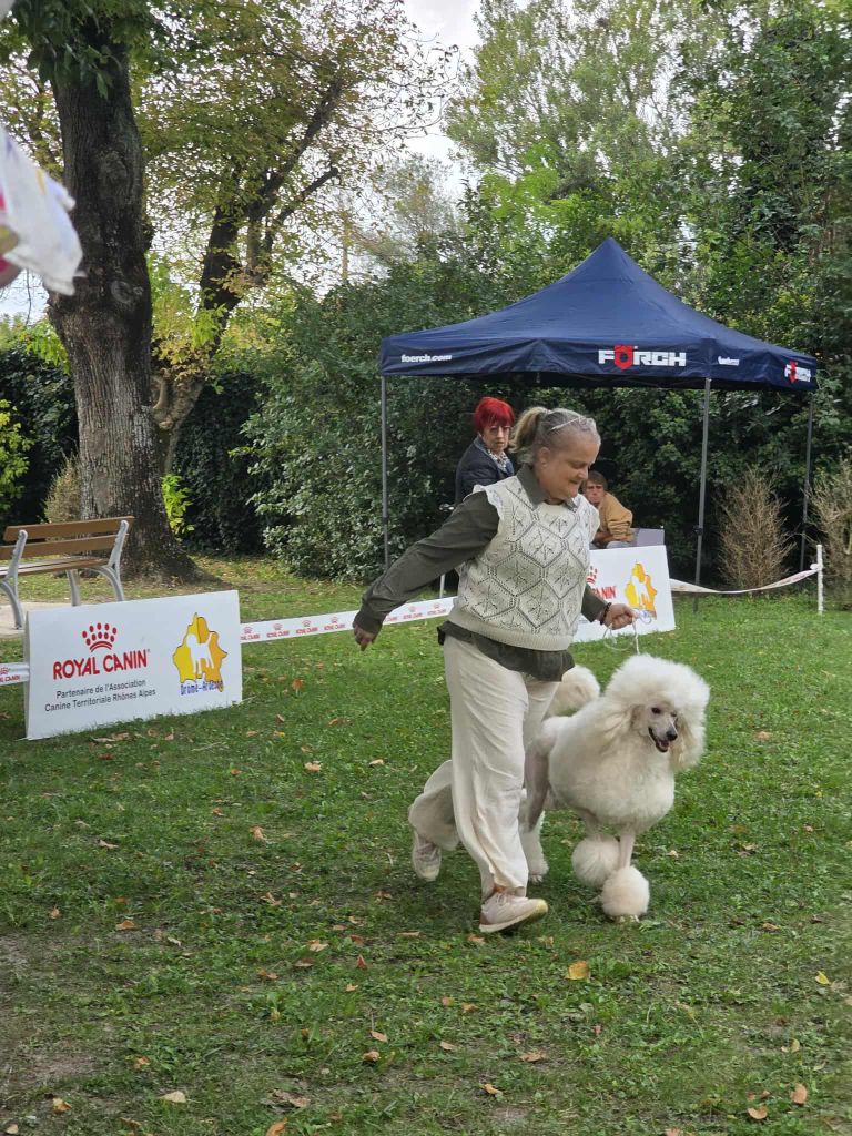 60 cm. Exc crâne chanfrein rectiligne. Exc denture. ?il de bonne forme et bien placé. Exc ligne de dos. Fouet bien inceré et porté. Poitrine ovale bien descendue. Epaule bien oblique. Exc pieds. Bonne angulation am. Allures libres et sautillantes